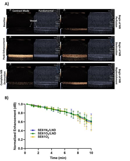 Acoustic enhancement and stability were quantified in vitro in a closed-loop flow phantom setup (ATS Laboratories, CIRS, Norfolk, VA, USA). Microbubbles were injected and insonated using a 10L4 transducer and an Acuson Sequoia ultrasound scanner (Siemens Healthineers, Issaquah, WA, USA) at room temperature. Imaging of the microbubbles flowing through the embedded vessel was performed in cadence pulse sequencing mode every 30 s for 10 min (n = 3, for microbubbles charged with O2 and N2 with and without LND) at low mechanical index (MI) imaging to visualize enhancement (MI = 0.12). The mean enhancement returned to the transducer was determined by drawing regions of interest on the contrast imaging plane; all analyses were performed in ImageJ (NIH, Bethesda, MD, USA). Enhancement (in dB) was determined every 30 s and plotted against time.