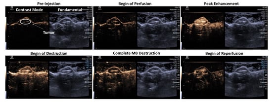 Illustrative ultrasound images of SE61O2/LND in an HNSCC tumor model generated in immunocompromised mice in dual B-mode/cadence pulse sequencing mode. Images show pre-injection of microbubbles (MB), start of MB perfusion, peak enhancement post-injection, start of MB destruction, complete MB destruction, and start of reperfusion (image depth corresponds to 0.3 cm increments). The left side of the display is the nonlinear imaging mode (contrast), and the right is the conventional B-mode (grayscale imaging).