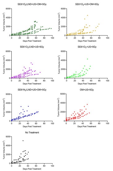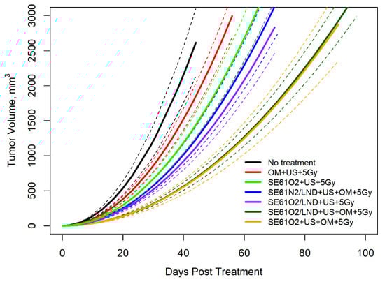Therapeutic enhancement evaluated in an HNSCC tumor model is shown in Figure 4 comparing tumor growth over time. The results demonstrate that despite some expected variability due to differences in tumor size and growth rate, the experimental group that received SE61O2/LND with OM pre-treatment followed by 5 Gy delivered with F1 had improved tumor growth control compared to animals in the SE61O2 + US + 5 Gy, OM + US + 5 Gy, and the no treatment groups. These results were further confirmed after fitting to a regression model curve, shown in Figure 5. Both O2 microbubbles (shown in dark green and orange) receiving OM pre-treatment and 5 Gy showed a statistically significant improvement in tumor control relative to the other controls (p < 0.01) other than N2 microbubbles (blue in the plot) and LND microbubbles without OM (purple in the plot). For LND-loaded bubbles treated with ultrasound and 5 Gy radiation, the presence of O2 (versus N2) showed approximately 20 days of improvement in tumor control, although this was not statistically significant (p = 0.11). However, no differences were observed in tumor growth volumes between animals receiving OM pre-treatment, 5 Gy radiation, and O2 microbubbles with or without LND (p = 0.83) and SE61O2/LND with or without OM (p = 0.17). These results indicate that while the addition of each mitochondrial tumor respiration inhibitor alone improves tumor control, no additional benefit is provided by combining multiple inhibitors.