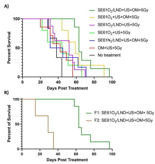 Survival proportion of animals following treatment until day of sacrifice. (A) Animal survival of all groups; treated groups received radiation with Filter 1 (F1; 3.59 cGy/min). (B) A comparison of the experimental group (SE61O2/LND) with ultrasound triggering (+ US) and metformin pre-treatment (OM) that received radiation with Filter 1 (dark green plot) and animals treated with the same treatment but that received radiation with Filter 2 (F2; 1.36 cGy/min) (brown plot).