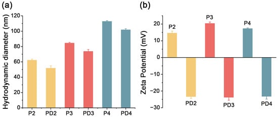 Dynamic light scattering was employed to investigate the sizes and zeta potentials of polymeric micelles. As shown in Figure 1a, the hydrodynamic diameters of the polymeric micelles ranged from 52 nm to 113 nm. Elongation of the PLF block increases the particle size, whereas DCA modification slightly decreases the micellar diameter. The zeta potentials of the P2, P3, and P4 polymeric micelles are positive, ranging between 14.6 mV and 20.4 mV (Figure 1b), which can be ascribed to the protonated state of amino groups along the l-ornithine side chains under physiological conditions. Modification with DCA converted the charging state from positive to negative (Figure 1b), which is indicative of the success of the DCA modification. The morphology of the polymeric micelles was examined by TEM (Figure S4). The polymers P4 and PD4 adopted a spherical morphology with a relatively uniform particle size [35]. The smaller sizes of polymeric micelles obtained from the TEM measurements might be ascribed to the collapse and contraction of micellar structures during the process of sample preparation.