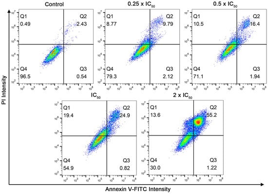 Figure 5. Flow cytometry analysis of untreated HepG2 cells and HepG2 cells treated with different P4 concentrations for 60 min. FITClow PIlow: live cells; FITChigh PIlow: apoptotic cells; FITChigh/low PIhigh: necrotic cells.
