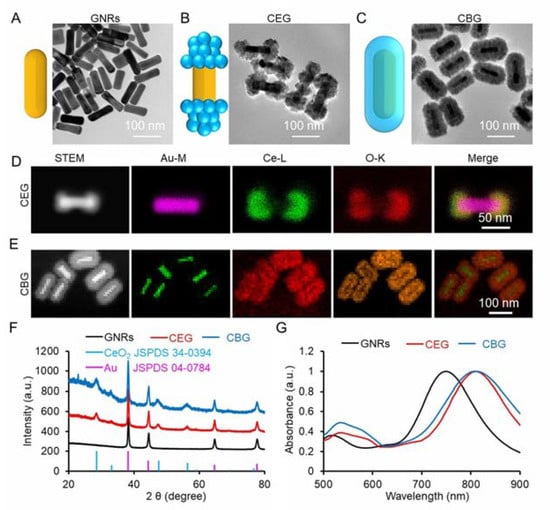 Physicochemical characterization of CEG and CBG NRs. (A–C) TEM images of GNRs, CEG, and CBG NRs, respectively. (D,E) STEM and EDS elemental mapping images of CEG and CBG NRs. (F) The XRD pattern of CEG and CBG NRs. (G) The UV-Vis-NIR absorption spectra of GNRs, CEG, and CBG.