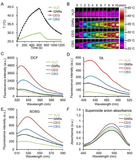The photothermal and photodynamic performance of GNRs, CEG, and CBG NRs. (A) Heating and cooling curves and (B) infrared thermal images of GNRs, CEG, CBG NRs, and H2O. Total ROS, abiotic •OH, 1O2, and O2•− assessments of GNRs, CEG, and CBG NRs (OD = 1) upon 808 nm laser irradiation (1 W/cm2, 10 min) assessed by DCF (C), TA (D), SOSG (E) and superoxide anion assay (F), respectively.