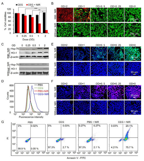 In vitro phototherapeutic efficacy of CEG in 4T1 cells. (A) Result of CCK-8 assay showing the cell viability of 4T1 cells following the treatment of CEG (OD = 0, 0.25, 0.5, 1, and 2) without or with 808 nm laser irradiation (1 W/cm2, 10 min). (B) Live/dead staining of 4T1 cells treated with CEG (OD = 0, 0.25, 0.5, 1, and 2) without or with 808 nm laser irradiation (1 W/cm2, 10 min). (C) Results of western blotting showing the expression levels of HSP-70 and HO-1 without or with NIR laser irradiation. (D) Flow cytometric analysis of intracellular ROS levels in 4T1 cells after the treatment of CEG upon 808 nm laser irradiation or not. CLSM images of (E) mitochondrial membrane depolarization (JC-1, green) and (F) superoxide production (Mitosox Red, red). DAPI staining for Cell nuclei (blue). (G) Analysis of flow cytometry for the apoptotic 4T1 cells induced by CEG upon 808 nm laser irradiation or not. Statistical differences were determined by Student’s t-test. * p < 0.05, ** p < 0.01, *** p < 0.001.