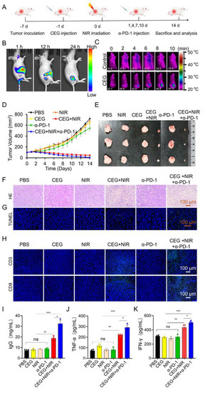Encouraged by the satisfactory phototherapeutic effects in vitro, in vivo photoimmunotherapy of CEG NRs under NIR laser (1 W/cm2) irradiation was assessed on 4T1 tumor-bearing mouse models. Figure 5A exhibits the animal experiment design. The tumor-bearing mice were randomly divided into six groups: (1) PBS, (2) CEG, (3) NIR, (4) CEG + NIR, (5) α-PD-1, and (6) CEG +NIR + α-PD-1. First, the biodistribution of CEG in vivo was tracked by fluorescence imaging of live animals. Cy7-labeled CEG (CEG-Cy7) was intravenously administered, and the fluorescence photographs were collected at 1, 12, and 24 h after administration. As shown in Figure 5B, there is a noticeable accumulation of CEG-Cy7 in the tumor site in a time-dependent manner as a result of the improved permeability and retention (EPR) effect. The abundant accumulation of CEG in the tumor region was a premise for the in vivo treatment. Then, the in vivo therapeutic effect of CEG was investigated after intravenous injection of CEG (OD = 60). As seen in the infrared thermal image (Figure 5C), the temperature of the tumor region raised from 26 °C to about 43 °C after intravenous administration of CEG (OD = 60) with NIR laser irradiation, promising for the PTT and PDT performance. Afterward, the anti-tumor effects of CEG were measured by monitoring the tumor growth for up to two weeks after treatment. The tumor growth profile (Figure 5D) and representative photographs of tumor tissues at the treatment endpoint (Figure 5E) revealed a remarkable tumor regression effect in the CEG + NIR and CEG + NIR + α-PD-1 groups, and the latter showed a better inhibition effect. In comparison, other groups demonstrated a little inhibitory effect on tumor growth. Then, harvested tumors of different groups were used for subsequent H&E staining and TUNEL staining. Figure 5F,G exhibited that CEG + NIR and CEG + NIR + α-PD-1 showed severe apoptosis as well as obvious tumor destruction under NIR laser irradiation, among which the latter had the best efficacy. In contrast, no significant damage was observed in tumor tissue in all of these groups without NIR light exposure.