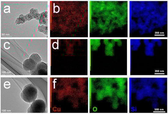 TEM (a,c,e) and STEM-EDX (b,d,f) images of MS-Cu nanospheres with different particle size. MS-Cu-1 (a,b), MS-Cu-2 (c,d), MS-Cu-3 (e,f).
