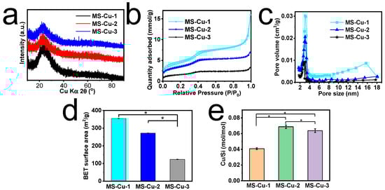Physicochemical characterization of MS-Cu nanospheres with different particle size. XRD patterns (a), N2 adsorption-desorption isotherms (b), pore size distributions (c), BET surface areas (d), and Cu/Si mol ratio (e) of MS-Cu-1, MS-Cu-2, and MS-Cu-3 (*, p < 0.05).