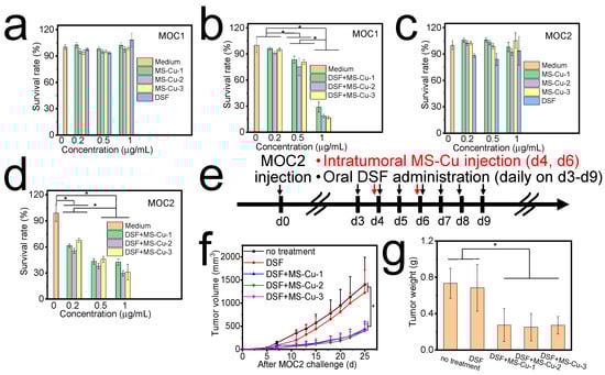 Cytotoxicity of only MS-Cu nanospheres (a,c), only DSF (a,c), and combination of MS-Cu nanospheres and DSF (b,d)against MOC1 (a,b) and MOC2 (c,d) cells in vitro. In vivo antitumor efficacy of combined oral administration of DSF and intratumoral administration of MS-Cu nanospheres. Experimental protocol (e), tumor volume (f), and tumor weight at the endpoint (g) (*, p < 0.05).