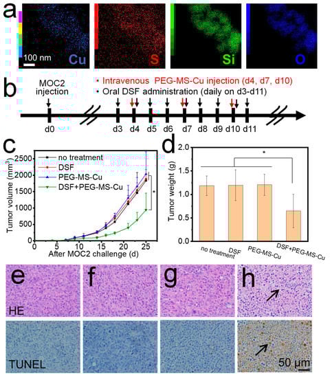 Combination of oral administration of DSF and intravenous administration of PEG-MS-Cu nanospheres inhibited MOC2 cell growth in vivo. STEM-EDX images of PEG-MS-Cu nanospheres (a). In vivo antitumor efficacy of combined oral administration of DSF and intravenous administration of PEG-MS-Cu nanospheres. Experimental protocol (b), tumor volume (c), and tumor weight at the endpoint (d). HE and TUNEL staining of tumor with no treatment (e), after only oral administration of DSF (f), only intravenous administration of PEG-MS-Cu nanospheres (g), and combined oral administration of DSF and intravenous administration of PEG-MS-Cu nanospheres (h) (*, p < 0.05).