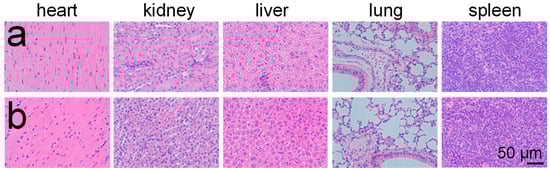 Combination of oral administration of DSF and intravenous administration of PEG-MS-Cu nanospheres showed no obvious toxicity to normal tissues in vivo. Histological sections of heart, kidney, liver, lung, and spleen of mice without any treatment (a), and with combined oral administration of DSF and intravenous administration of PEG-MS-Cu nanospheres (b).