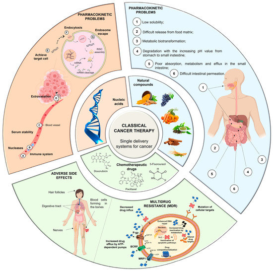 Conventional therapy has evident benefits in cancer treatment; however, despite the continuous emergence of new anticancer agents, the majority of chemotherapy-based treatment continues to remain ineffective due to an array of factors, which include chemotherapy-induced toxicity and adverse reactions, insufficient target specificity, and, most importantly, drug resistance during cancer progression (Figure 1) [9].