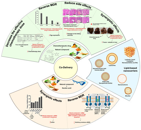 Schematic illustration of lipid-based nanocarriers and advantages of their use for the co-delivery of natural compounds and chemotherapeutic drugs or nucleic acids. Adapted from [36,37], and from [38,39] with permission from Elsevier.