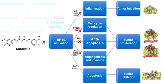 Potential targets associated with Curcumin anticancer activity. This natural compound induces a reduction in its target genes by inhibiting NF-kβ signaling. Bcl-2-B-cell limphoma-2; COX-2-ciclo-oxigenase-2; IL-6-interleukin 6; IL-10-interleukin 10; IL-18-interleukin 18; MMP9-matrix metallopeptidase 9; NF-kβ-nuclear factor kappa B; VEGF-vascular endothelial growth factor; XIAP-X-linked inhibitor of apoptosis protein.