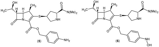 The work-up of the aqueous solution together with the purifying effect of acetone, used in crystallization, led to the isolation of crude meropenem (1) in Table 1 with an assay result of 98% and a yield of 74%. Compared to the data reported in literature [48], our system has proven to perform better. An LC-MS analysis (Supplementary Figure S5) of the product derived from Entry 4 identified two impurities, p-amino (5, 0.7%) and p-hydroxylamino (6, 0.3%) derivatives, which arose after the removal of the pNZ side chain from the stepwise reduction in the nitro group in the transient mono-protected pNB compound (Figure 3). These structures would seem to indicate the reaction mechanism proposed in Figure 2. The purification of the crude product purged these impurities and gave a pure product with 99.5% assay result, comparable to commercial product.