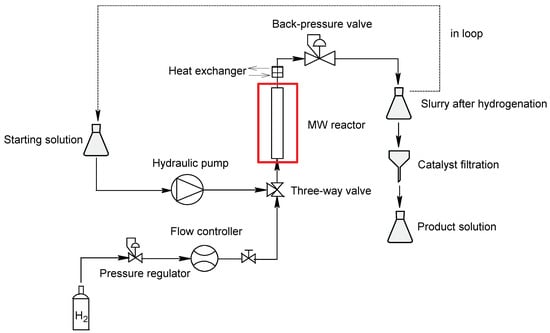 MW-assisted flow hydrogenation was carried out in the FlowSYNTH reactor (Milestone Srl, Bergamo, Italy), which is a multimode system that operates at 2.45 GHz and is equipped with a vertical PTFE-TFM flow-through reactor that can work up to a maximum temperature of 200 °C and 20 bar of pressure, in open or closed loop modes. A three-way connection fitted with a non-return valve allows the starting solution and hydrogen feeds to be pumped simultaneously. A back-pressure valve placed on the top of the reactor, after a water-cooled heat exchanger, ensures pressure control and flow-stream decompression, allowing the solution to be collected. For a single cycle run, the slurry was run in the reactor (VR = 200 mL) using a hydraulic pump and was collected in an Erlenmeyer flask after catalyst filtration, and this was performed in loop for multiple-cycle runs. The starting solution and hydrogen flowed from the bottom to the top of the reactor, with the applied MW power being modified in real time to maintain the predefined temperature. The pressure was kept constant using a hydrogen mass flowmeter at the indicated pressure. Integrated reactor sensors continuously monitored the internal pressure, temperature and applied power inside the reactor for each run. Leak tests were successfully performed first with water and then with isopropyl alcohol and nitrogen to test the pressure control. A general scheme of the FlowSYNTH reactor is depicted in Scheme 3.