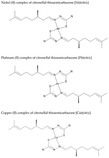 [Ni(tcitr)2], [Pt(tcitr)2], and [Cu(tcitr)2] were synthesized and characterized following the detailed protocol reported in our previous works [46,49,50]. Figure 1 shows the schematic representation of the synthesized metal complexes.