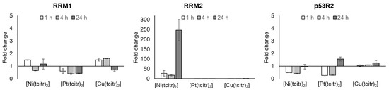 In previous works, we observed that the metal complexes caused important DNA damage that could be recognized by several DNA damage response pathways [46,49]. After DNA damage induced by genotoxic stress, p53 induces cell-cycle arrest, expression, and nuclear accumulation of p53R2, an additional small subunit, that interacts with RRM1 and has been identified as a transcriptional target of p53. The mechanism by which p53R2 activity is induced by p53 may not be rapid enough to supply dNTPs to prompt DNA repair, which can be completed within a few hours after DNA damage [60,61]. In this context, to understand if the cellular response to DNA damage induced by the metal complexes could involve the p53 pathway, we analyzed the expression of the p53R2 subunit of the RR: in this case, [Cu(tcitr)2] did not disrupt the basal level of expression of p53R2; while [Ni(tcitr)2] and [Pt(tcitr)2] caused a mild downregulation of gene expression at 1 and 4 h treatments (Figure 3) (Table S3).