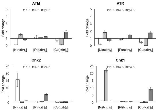 The early DNA damage induced by [Ni(tcitr)2] upon a 1 h treatment [46,47] was able to activate Chk2 transcription, as shown by our results: the treatment with [Ni(tcitr)2] in U937 cells caused ATM downregulation after 1 h followed by the restoring of the basal expression level after 4 and 24 h. On the contrary, we observed an early and strong upregulation of Chk2 (Figure 4) (Tables S4 and S5).