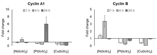 The nickel complex preserved the basal gene expression of cyclin A1, while a decrease in cyclin A expression was observed after 4 and 24 h treatment with [Cu(tcitr)2] (Figure 5) (Table S8). An interesting upregulation of the cyclin A gene has been observed after 24 h treatment with [Pt(tcitr)2] (Table S8).