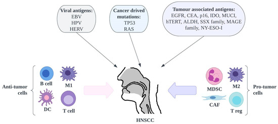 Overview of cancer antigens, immunosuppressive and anti-tumour immune cells in HNSCC. ALDH—aldehyde dehydrogenase, CAF—cancer-associated fibroblast, CEA—carcinoembryonic antigen, DC—dendritic cell, EBV—Epstein-Barr virus, EGFR—epithelial growth factor receptor, HERV—human endogenous retroviruses, HNSCC—head and neck squamous cell carcinoma, HPV—human papillomavirus, hTERT—human telomerase reverse transcriptase, IDO—indoleamine-2,3-dioxygenase, M1—macrophage 1, MAGE—melanoma-associated antigen, MDSC—myeloid-derived suppressor cell, MUCI—mucin-1, NK—natural killer cell, NY-ESO-I—New York esophageal squamous cell carcinoma-1, SSX—synovial sarcoma X, T reg—T regulatory cell.