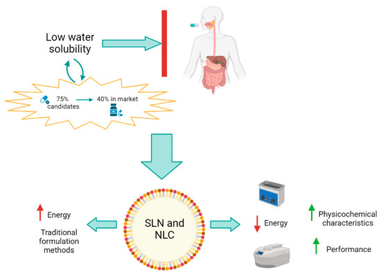 Despite these distinguished benefits offered by SLNs, there are drugs that have greater solubility or compatibility with liquid lipids [6,8]. This can be evidenced at the time of formulating SLN, where applying heat to promote the fusion of the lipid solid facilitates the incorporation of the drug into the matrix. However, when it is dissolved again at room temperature, the crystallization of the lipid (return to the solid state) can generate the expulsion of the drug. That is why the development of new formulations of lipid nanocarriers that could overcome this problem was proposed [28,29,56,59].