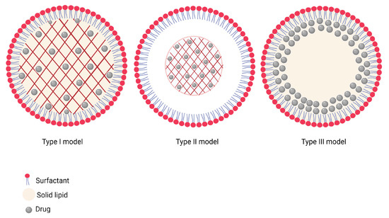 The production conditions, nature, and concentration of excipients have given rise to three possible distribution models of drugs in SLNs observed during different research by transmission electron microscopy (TEM) and scanning electron microscopy (SEM) (schematized in Figure 2) [56,57]. These models (Figure 3) are made up of: