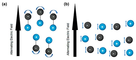 In ionic conductance, species such as charged ions in solutions or electrons in solids are moved by the alternating electric field. These are aligned with the oscillation of said field (Figure 7b), which generates greater kinetic energy that is transformed into heat through molecular collision [69,70,72].