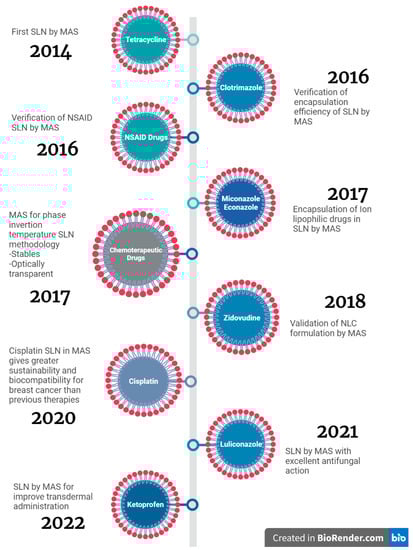 Continuing in terms of innovation regarding the introduction of MAS as a formulation technique for lipid nanoparticles, NLC were developed for the first time in 2018. This is with the aim of observing if there were variations in the properties reported by the hot ultrasonication formulation methodology. The designed NLCs were directed towards the encapsulation of the antiretroviral agent zidovudine (AZT) since, although it is a type I drug according to the biopharmaceutical classification system, it has low oral bioavailability and the possibility of producing granulocytopenia and anemia. The development and optimization of NLC formulations were supported by a quality-by-design (QbD) approach. The formulation components corresponded to Precirol®® ATO 5 as lipid solid, Miglyol®® 812 as lipid liquid, Tween®® 80 as surfactant, water, and AZT. Regarding the physicochemical characteristics obtained, in terms of hot ultrasonication, sizes of 266 ± 4 nm, PDI of 0.168 and a zeta potential of −29 ± 2 mV were achieved. In contrast, for this same formulation made by MAS, the results were 113 ± 3 nm in size, a PDI of 0.216, and a zeta potential of −20 ± 1 mV. As it could be observed, MAS provided smaller sizes. According to these physicochemical characteristics, both formulations presented an adequate profile for oral administration (particle size between 100 and 300 nm, PDI < 0.3 and negative zeta potential > −20 mV). Similarly, both formulations were physically stable for at least 45 days and were not toxic to Jurkat T cells. They also exhibited spherical shape and release studies presented controlled release of AZT under gastric and plasma-simulated conditions. Therefore, this research showed that it is possible to make NLC by the MAS method [79].
