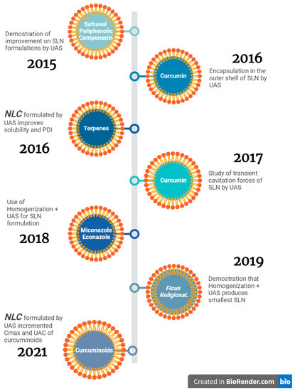 Recently, microwave-assisted synthesis (MAS) and ultrasound-assisted synthesis (UAS) stood out as efficient methods for the fabrication of lipid nanovehicles with improved physicochemical characteristics. Especially the size control in the preparation of smaller particles and generally lower polydispersity indices, representing a valuable improvement in the generation of colloidal nanocarriers. This is also potentiated by one of the greater attributes of those synthesized techniques: their green approaches, constituting a novelty in the SLN and NLC formulations, generating vehicles by using higher energy efficiency in less time than previous, classically used methods [24,26,27].