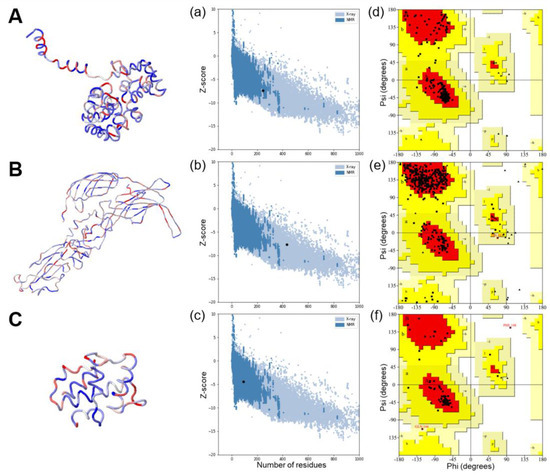 Characterization of vaccine antigens. (A–C) Predicted 3D structure of vaccine constructs. (a–c) ProSA web with z-score indicates overall model quality and recognizes errors in 3D model of vaccine antigens. (d–f) Ramachandran plot describes the validation of the vaccine construct by showing amino acids in favored and allowed regions.