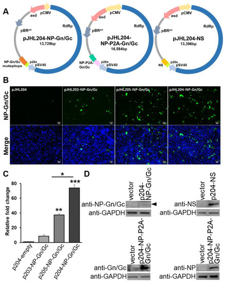 HEK293T cells were seeded into 6-well plates (1 × 106 cells/well) and were transfected with pJHL204-empty as a vector control, pJHL204-NP-Gn/Gc, pJHL204-NP-P2A-Gn/Gc, or pJHL204-NS plasmids (1ug/uL) using Lipofectamine™ 3000 Transfection Reagent (Invitrogen, Waltham, MA, USA). After 48 h post-transfection, cells were lysed by RIPA buffer containing a protease inhibitor cocktail (Thermo Fisher Scientific, Waltham, MA, USA). Cell lysates were subjected to 12% SDS gel electrophoresis and transferred to a PVDF membrane (Millipore, Burlington, MA, USA). Membranes were blocked with 5% skim milk for 1 h and incubated with rabbit hyperimmune sera against NP-Gn/Gc-epitope, NP, Gn/Gc, and NS (1:1000) overnight at 4 °C, respectively. Membranes were then incubated with goat anti-rabbit HRP-IgG (Southern Biotech, Birmingham, AL, USA) or goat anti-mouse HRP-IgG (Southern Biotech) antibody (1:5000) for 1 h at room temperature. Finally, membranes were developed with Amersham ECL detection reagents (Cytiva, Marlborough, MA, USA) and visualized using an Amersham ImageQuant 800 imaging system (Cytiva).