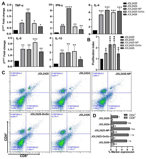 Cytokine profiling confirmed that mice immunized with strains JOL2424 (NP-Gn/Gc-epitope), JOL2425 (NP-P2A-Gn/Gc), and JOL2426 (NS) induced Th1/Th2-based immune responses (Figure 3A). The upregulated IFN-γ plays a significant role in curbing host immune response by promoting major histocompatibility complex (MHC)-I antigen presentation and activation of T-helper cell responses [55]. We also observed that NP protein upregulated the cytokine IL-4 secretion in mice immunized with JOL2425, indicating stimulation of Th2 cells which will activate B cells to produce IgG [56]. This balanced Th1/Th2-based immunity induced by vaccine constructs will play a pivotal role in fighting against viral infectious diseases. The T-cell responses are considered the central immune mechanism against intracellular pathogens [57,58]. Mice immunized with JOL2424, JOL2425, and JOL2426 induced strong antigen-specific CD4+ T and CD8+ T cell response. However, we observed comparatively higher NS-specific CD8+ T cell response in mice immunized with JOL2426 (Figure 3C). This result is correlated with a previous study, where a higher NS-specific CD8+ T cell response was observed in mice immunized with a DNA vaccine expressing NP and NS [59]. The dramatic loss of T cells in SFTSV-infected patients directly affects viral clearance due to inadequate phagocytosis of virus-infected cells [60]. Therefore, the vaccine constructs exhibited a cell-mediated response that can stimulate CD4+ and CD8+ T cells to promote antigen-specific neutralizing antibody production and viral clearance by activating cytotoxic T cells, respectively [61,62].