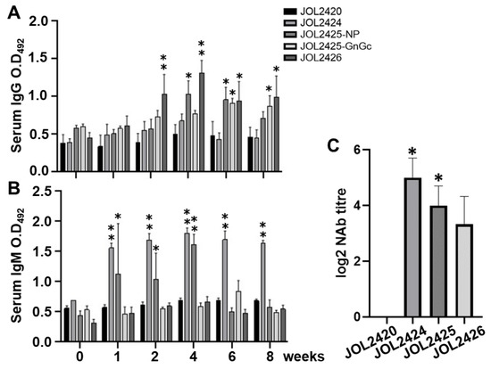 The expression of Th2 cytokines IL-6 and TNF-α in immunized mice indicates the induction of the humoral response (Figure 3A). As a direct and accurate determination of humoral immune responses, antigen-specific IgG and IgM levels in immunized serum samples were examined by indirect ELISA. After the 2-week post-booster immunization, mice immunized with JOL2425 and JOL2426 induced significantly higher IgG antibody levels than the control group (Figure 4A); mice immunized with JOL2424 showed substantially higher serum IgM levels (Figure 4B). These results correlate with the induction of neutralizing antibodies in which immunized mice generated higher neutralizing titers against SFTSV. Notably, mice immunized with JOL2424 and JOL2425 had neutralization titers of 5.0 and 4.0 FRNT50 (log2), respectively (Figure 4C). Our results suggest that mice immunized with JOL2424 and JOL2425 effectively induced both humoral and neutralizing antibody responses against SFTSV.