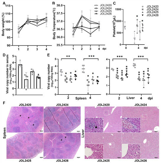 We investigated the protective efficacy of the constructs using an hDC-SIGN-transduced mouse model. One week after transduction, each group of mice (n = 8) were challenged with 1 × 103 FAID50 SFTSV and sacrificed on days 2 (n = 4) or 4 (n = 4) post-infection. Mice immunized with JOL2420 and JOL2424 showed slightly increased body temperature. In contrast, mice immunized with JOL2425 and JOL2426 did not present noticeable variations in body temperature during the experiment (Figure 5A). In addition, we did not observe a significant reduction in body weight among mice in any of the immunized groups. However, mice in the PBS group experienced a considerable weight loss from 1 to 3 dpi (Figure 5B). All immunized mice (JOL2424, JOL2425, and JOL2426) maintained average platelet counts following the SFTSV challenge, but a significantly reduced platelet (PLT) count was seen at 4 dpi in the control group (JOL2420). The expected reference range of PLT in normal laboratory mice is 668–1543 × 103/μL [47] (Figure 5C). In addition, viral load in serum, spleen, and liver samples were determined by qRT-PCR. Compared to the control group, viral copy numbers in the serum (Figure 5D), spleen, and liver (Figure 5E) samples were significantly reduced in all immunized groups (p ≤ 0.001 and p ≤ 0.005). Furthermore, mice in the all-immunized group showed reduced liver necrosis or hepatocyte degeneration and reduced loss of white pulp in the spleen (Figure 5F).