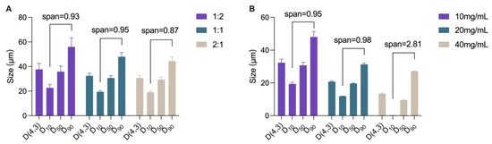 The size variation of IPP-PEs prepared with different (A) water: oil ratios and (B) CUR concentrations. D(4,3) refers to mass or volume moment mean diameter. D10, D50, and D90 refer to the diameter below which there are 10%, 50% and 90% of particles.