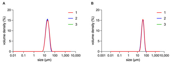 The size distribution of (A) IPP-PEs and (B) SO-PEs. 1, 2, and 3 represents the triplicate measurement.