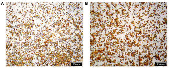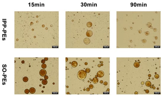 The optical micrographs of IPP-PEs and SO-PEs are displayed in Figure 5. Most of them present spherical morphology, and their diameters were consistent with the results of Section 3.4.1.