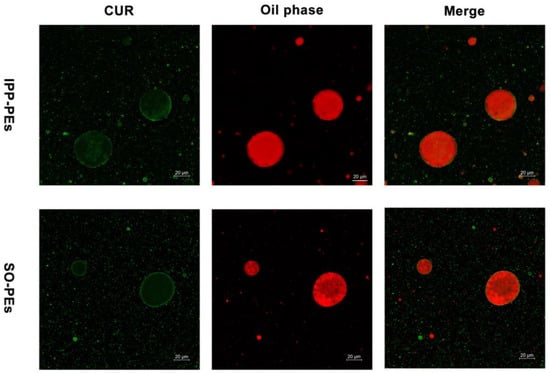 Prior to CLSM imaging, Nile Red solution (0.1 mg/mL in alcohol) was used to label the oil phase of IPP-PEs and SO-PEs. Twenty microliters of Nile Red solution were fully mixed with 0.5 mL Pickering emulsions. The stained Pickering emulsions were then diluted 2-fold with deionized water, which were dripped onto microscope slides and covered with coverslips. The slides were then observed under CLSM.The fluorescence of CUR and Nile Red was excited at wavelengths of 488 nm and 561 nm, respectively. The resolution of the scan was set to 1024 × 1024 pixels.