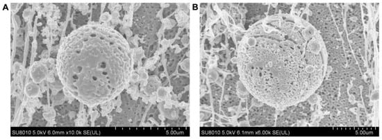For Cryo-SEM, the method was according to a previous study []. Samples were spread onto the perforated stub and freeze-dried (ES-2030, Hitachi, Tokyo, Japan). Then, samples were sputter-coated with gold by an ion sputter (E-1010, Hitachi, Tokyo, Japan) and observed by SEM (SU8010, Hitachi, Tokyo, Japan) under a high vacuum with an acceleration voltage of 5.0 kV.