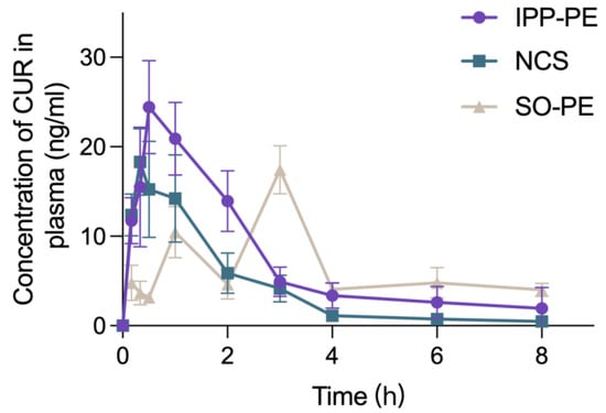 The Plasma concentration–time curves of IPP-PEs (n = 6), SO-PEs (n = 4), and CUR-NCs (n = 6) after a single administration at the CUR dose of 100 mg/kg in rats. (mean ± SD).