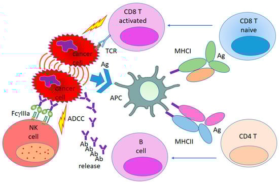 Augmented cancer–immunity cycle. The classic activation, through MHCI-CD8-acivated T cells, is on the upper side. The MHCII-CD4-NK axis is at the bottom. Ag—antigen, Ab—antibody, TCR—T cell receptor, and FcγIIIa—low affinity immunoglobulin gamma Fc region receptor III-A (CD16a).