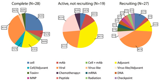 Since all the advantages of intratumoral administration in terms of basic principles to their use in gene therapy are considered in the above works [48,53], we will not repeat the previously analyzed examples. However, we will proceed to review data from clinical studies in which intratumoral administration was used. Therefore, at the moment, there are 818 studies in the Clinical Trials database (“https://clinicaltrials.gov/ (accessed on 19 February 2023”) for the query “Intratumoral/Cancer”. With the introduction of the restriction “immunotherapy intratumoral”, 135 studies can be found. We analyzed data from such studies in more detail, limiting the search to studies on recruitment status: Complete (31); Active, not recruiting (26); and Recruiting (42) (see Supplementary Table S1). Only studies that included intratumoral administration of a specific drug, not studies of intratumoral drugs or cell distributions, were selected. The results are presented in Figure 2.