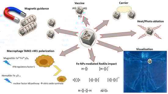 MNPs can perform completely different roles: (1) as a carrier, delivering different molecules to the tumor [99]; (2) as a functional agent, depending on physical and chemical properties — acting as a photothermal vaccine [100], photodynamic activator [101], magnetic guidance [102], etc.; and (3) as an immunomodulator [103].