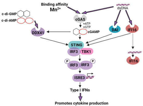 Mn2+ as an activator of the cGAS-STING pathway. Abbreviations: cGAS—cGAMP synthase; IFI16—interferon γ-inducible protein 16; DDX41—helicase DEAD box polypeptide 41; c-di-GMP—cyclic di-GMP; c-di-AMP—cyclic di-AMP; STING—stimulator of interferon genes; IRF3—interferon (IFN) regulatory factor 3; TBK1—TANK-binding kinase 1; cGAMP—cyclic guanosine monophosphate-adenosine monophosphate; DAI—DNA-dependent activator of IRFs; IFNs—type-I interferons; STING (also known as MITA, MPYS, or ERIS); cGAMP—cyclic GMP-AMP; and IRF3—IFN-regulatory factor 3.