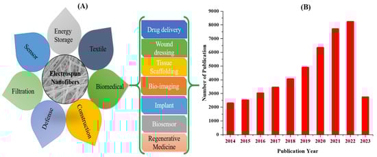 Due to the aforementioned characteristics of electrospun nanofibers, they can be applied for numerous applications such as catalysis, energy storage, environmental remediation, filter media, sensor, textile, protective clothing, biomedicals, fire retardant, etc. [,,,,,,,,,,,,,,]. Most importantly, the electrospun nanofibers can mimic the structure of the extracellular membranes (ECMs) [,,]. The porous architecture of the electrospun nanofiber scaffolds is critical in cell survival, proliferation, and secretion of ESM []. Good pore connectivity allows the effective transport of nutrients, oxygen, and metabolic waste products to and from cells [,]. The biocompatibility and biodegradability provide a good environment for cell adherence, differentiation, and proliferation, thereby widening the applications of electrospun nanofibers in biomedical fields such as wound dressing [,], tissue scaffolds [], drug delivery [], cosmetics [], implants [], biosensor [,], antibacterial agent [,], etc. A schematic diagram showing some potential biomedical applications of electrospun nanofibers is given in Figure 2A. Figure 2B presents a survey of the total publications related to biomedical applications of electrospun nanofibers between 2014 to April 2023. (The quantitative data were derived from the Dimensions database).