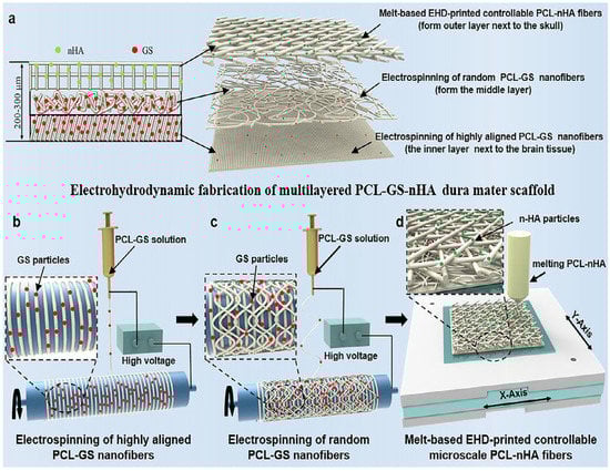 Schematic diagram showing the electrohydrodyamic fabrication of triple-layered micro/nano fibers of PCL-GS-nHA dura mater scaffold (a), electrospinning of aligned and random PCL-GS NFs ((b,c), respectively), and preparation of microscale PCL-nHA fibers by melt-based EHD printing (d) [].