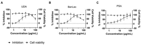 Anti-RABV activity of UDA, BanLec, and PSA in BHK-21J cells. Serial dilutions of UDA (A), BanLec (B), and PSA (C) were added together with mCherry-RABV (MOI = 0.01) to BHK cells. On day 5 p.i., the antiviral activity was determined by the quantification of the virus-induced mCherry fluorescence. In a parallel experiment, the effects of the lectins on cell viability were determined using a viability staining (MTS). The averages and standard deviations of 3 independent experiments are presented. Fitting the dose–response curves indicates an EC50 of UDA of 4.6 μg/mL and a CC50 of 65 μg/mL; an EC50 of BanLec of 6 μg/mL and a CC50 of 36 μg/mL; an EC50 of PSA of 18 μg/mL and a CC50 of more than 100 μg/mL.