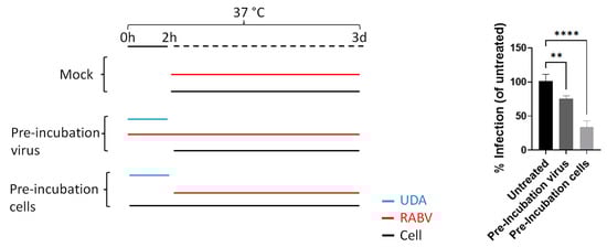 UDA inhibits RABV infection by mainly interacting with the cell. UDA at a final concentration of 25 µg/mL was pre-incubated with RABV or cells at 37 °C for 2 h. Next, UDA was diluted to a non-inhibitory concentration (1 µg/mL), and cells were further incubated with virus (MOI 0.1) for 3 days at 37 °C. Virus infection (%) was determined relative to the untreated condition. Each condition was tested in at least 3 independent experiments, and averages and STDEV were calculated. Tukey’s multiple comparisons test was used to calculate the statistical significance. (** p < 0.01, **** p < 0.0001).