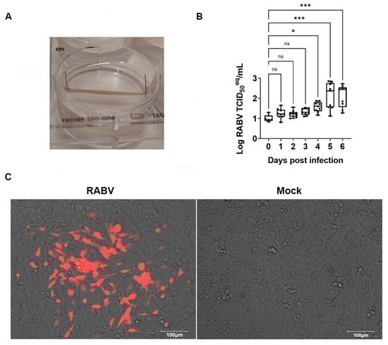 RABV replicates in swine skeletal muscle explants. (A) Picture of a swine muscle explant culture. The biceps femoris muscle was dissected from freshly euthanized pigs (3 months, female) and maintained under tension using pins. (B) Upon infection with RABV (SAD-B19-mCherry), culture supernatant was analyzed each day for levels of vRNA by RT-qPCR. Nine independent cultures were used; median and quartiles are indicated. Kruskal–Wallis test with Dunn’s multiple comparisons test was used to calculate the statistical significance. (ns, not significant; *, p-value < 0.05; ***, p-value < 0.001) (C) On day 6 p.i., the supernatants of the infected (RABV) and non-infected (Mock) muscle cultures were transferred to BHK cells, and after 7 days of incubation, the fluorescence of the cells was visualized by microscopy (the picture is a representative culture of 3 independent experiments). Scale bar: 100 µm.